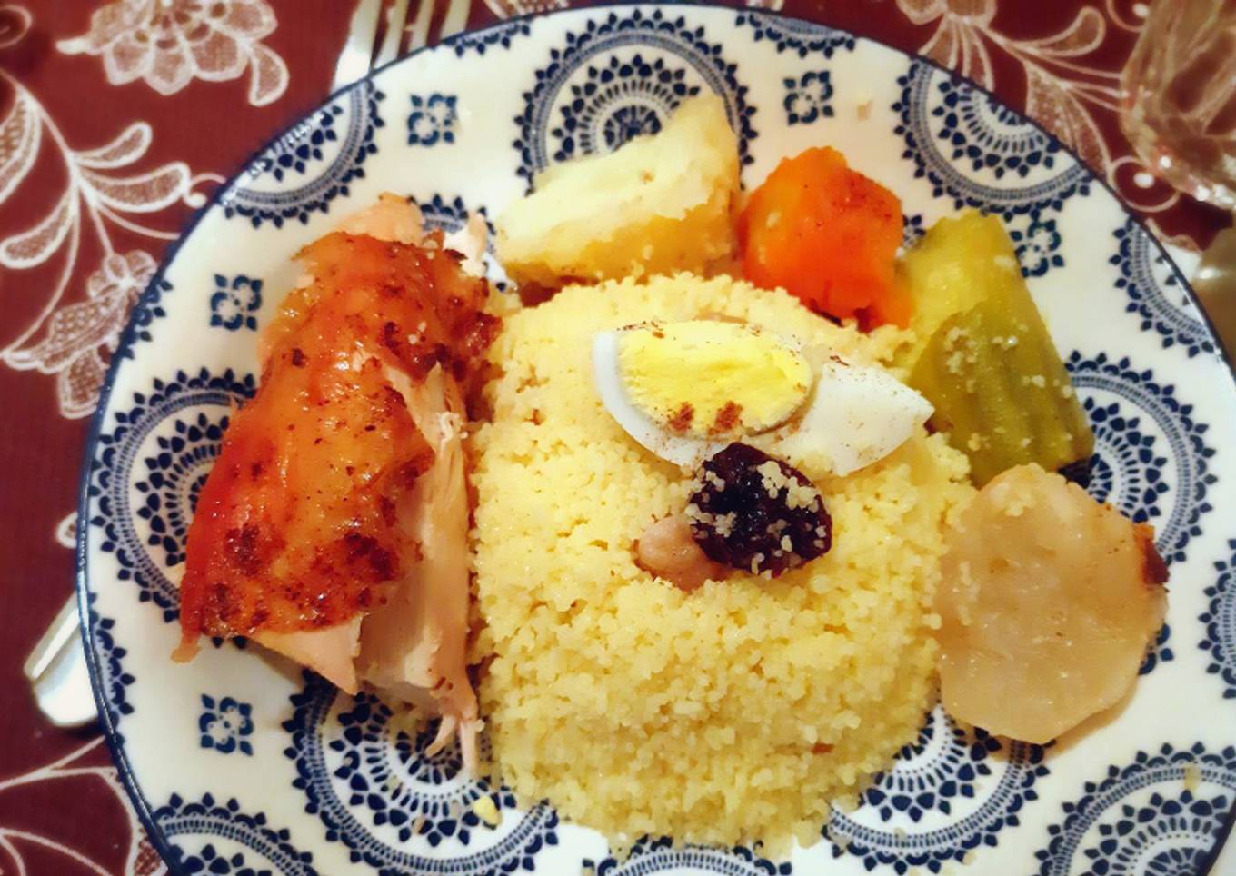 - Servez le couscous aux raisins secs accompagnez de poulet, légumes, pois chiches, oeufs durs et arrosez avec la sauce.