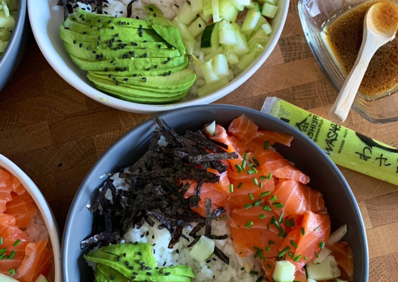 Pendant la cuisson du riz, préparer la garniture, émincé finement le saumon, éplucher et détailler le concombre en petits cubes, éplucher et tailler les avocats en lamelle. Ciseler les feuilles d'algue et la ciboulette - Montage :
