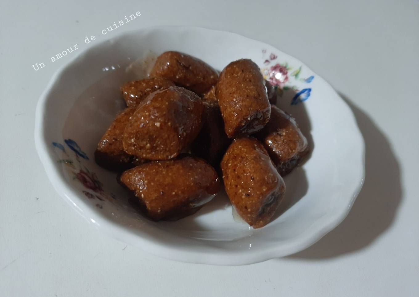 - Ensuite égouttez et plongez dans le miel préalablement fondu avec la cs d'eau de fleur d'oranger pendant 5 minutes ou le temps e finir de frire le reste des mini maktout.
