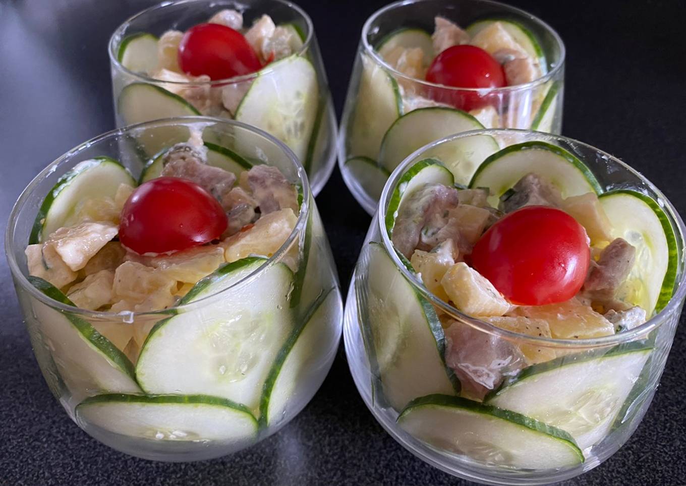 Mélangez bien et répartissez la salade dans les verrines. - Au moment de servir, décorez d’une rondelles de concombre,d’un quartier de tomate cerise.