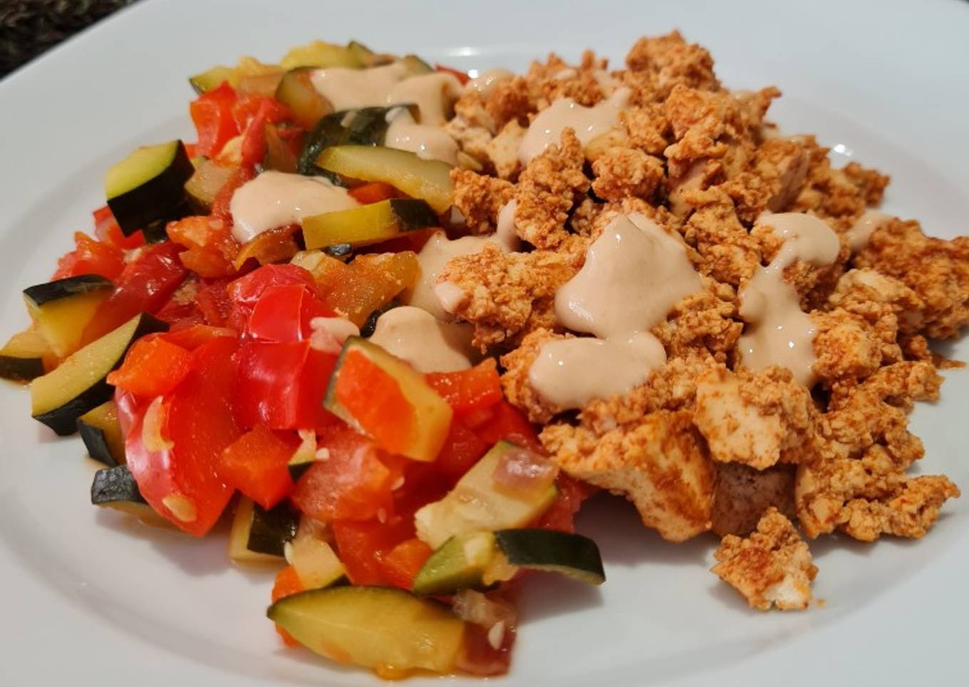 - Dans une assiette, servir moitié poêlée et moitié tofu en versant un peu de sauce par dessus
