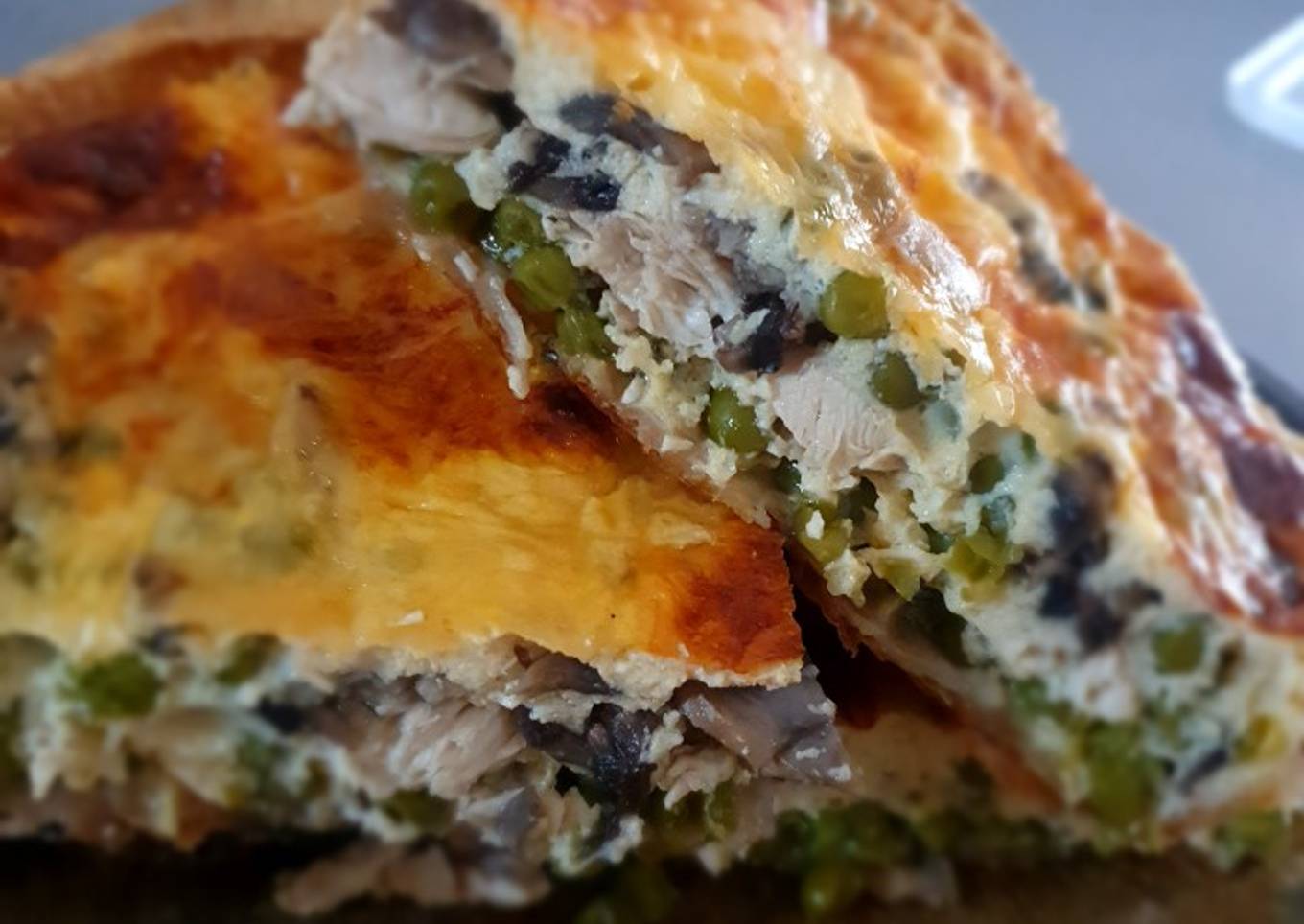 - Piquez le fond de pâte feuilletée, déposé une couche de petits pois, les champignons et le poulet puis une dernière couche de petits pois. Versez la préparation œufs et skyr ajoutez un peu de fromage râpé.